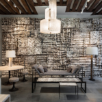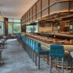 Le subtil rappel de la nature qui entoure le restaurant est mis en exergue par le chatoiement des matières velours et daim pour les sièges et par les panneaux en boiseries de chêne cérusé pour les murs. Ce challenge, hautement relevé par l’artiste, fut salué par la critique.